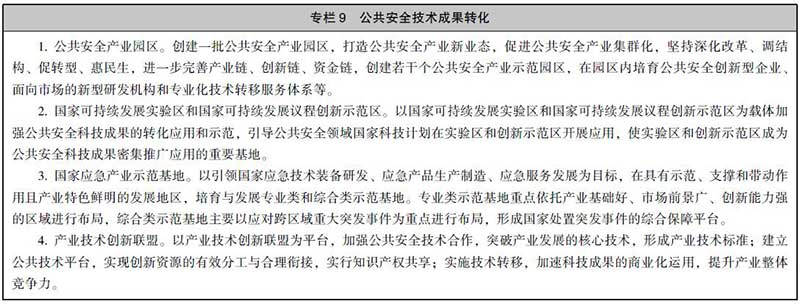 4.示范应用,培育产业。加强公共安全先进适用技术的综合集成,注重成果转化和应用示范。推动完善我国公共安全应急产品体系,培育和发展安全与应急产业。