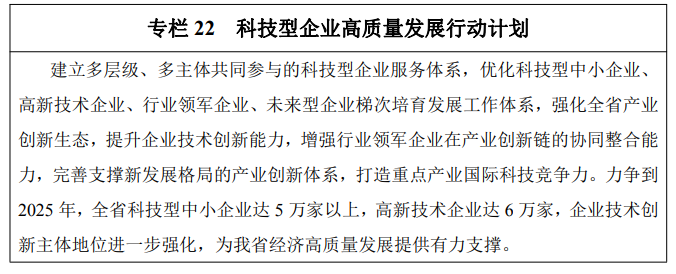 ——科技创新体系日益完善。国家实验室、国家技术创新中心建设有新突破,全省科学研究体系和技术创新体系布局进一步优化,高水平大学和高水平科研院所建设成效显著。企业技术创新主体地位更加突出,创新型企业持续蓬勃发展,涌现出一批世界级创新型领军企业和独角兽企业,高新技术企业、科技型中小企业数量继续保持全国前列。企业创新能力显著提升,规模以上工业企业研发经费支出与营业收入之比达1.8%。全社会创新氛围更加浓厚,公民具备科学素质比例达16%。