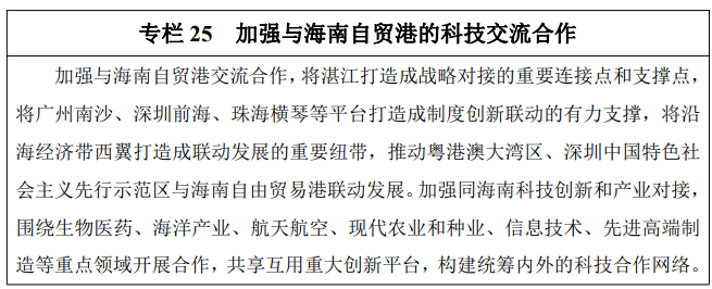 加强与泛珠地区科技合作。强化泛珠三角地区协同创新发展模式,实现区域间创新要素自由流动,推动科技创新平台的联合建设与项目课题联合申报。构建泛珠三角区域科技交易网络,实现网上技术市场互通和成果转移转化。积极贯彻落实国家珠江—西江经济带发展规划,以粤桂合作特别试验区科技合作为支点,推动科研项目合作研究和合作园区建设。深入推进与海南自由贸易港协同创新发展,支持湛江建设海南自由贸易区湛江承载区,推动粤港澳大湾区、深圳中国特色社会主义先行示范区与海南自由贸易港联动发展。
